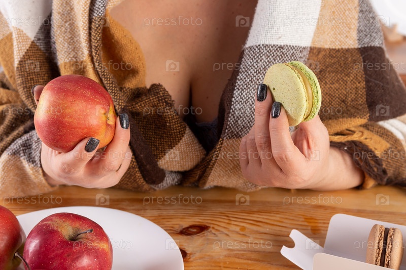 Брюнетка держит яблоко и печенье перед грудью
