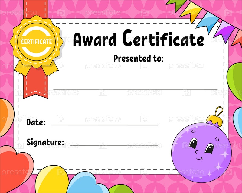 Образец сертификата для детей. Красочный диплом школы и дошкольного учреждения. С милым характером. Векторная иллюстрация
