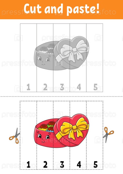 Изучение цифр 1-5. Вырезаем и приклеиваем. мультипликационный персонаж. Рабочий лист по развитию образования. Игра для детей. Страница активности. Векторная иллюстрация