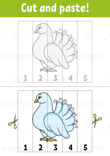 Изучение цифр 1-5. Вырезаем и приклеиваем. мультипликационный персонаж. Рабочий лист по развитию образования. Игра для детей. Страница активности. Векторная иллюстрация