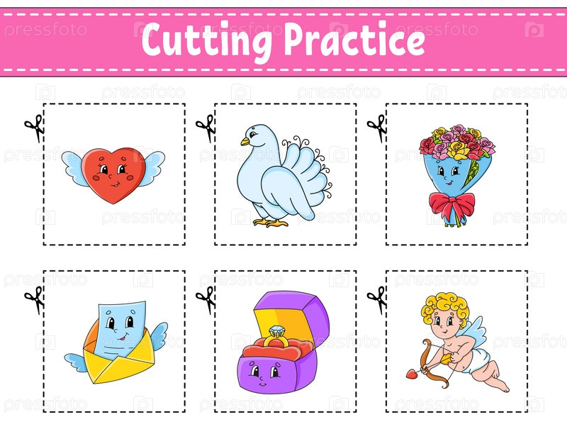 Практика вырезания для детей. Рабочий лист по развитию образования. Страница активности. Векторная иллюстрация