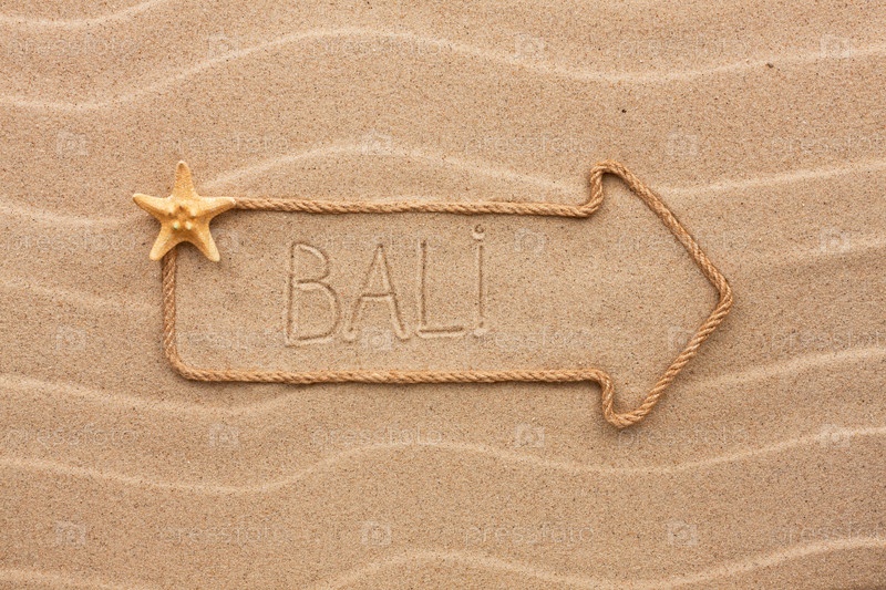 Стрела из веревки и морских ракушек со словом Бали на песке