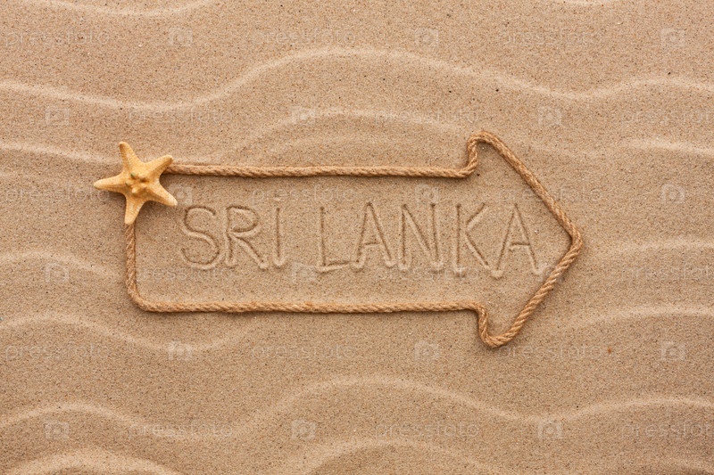 Стрела из веревки и морских ракушек со словом Шри-Ланка на песке