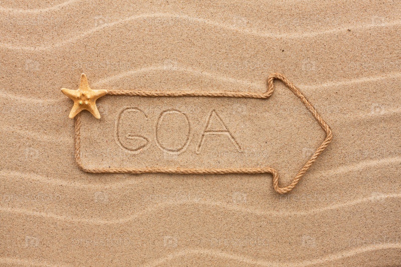 Стрела из веревки и морских ракушек со словом Гоа на песке