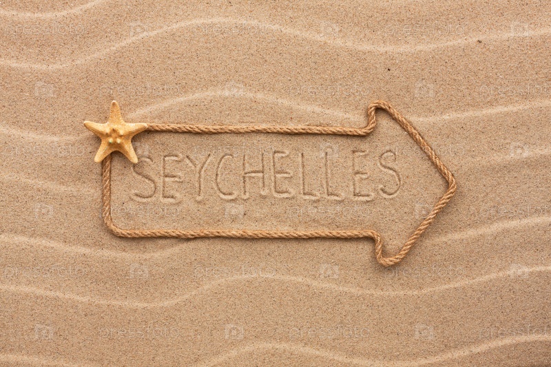 Стрела из веревки и морских ракушек со словом Сейшельские острова на песке