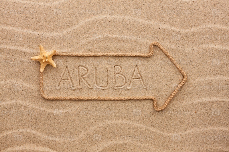 Стрела из веревки и морских ракушек со словом Аруба на песке