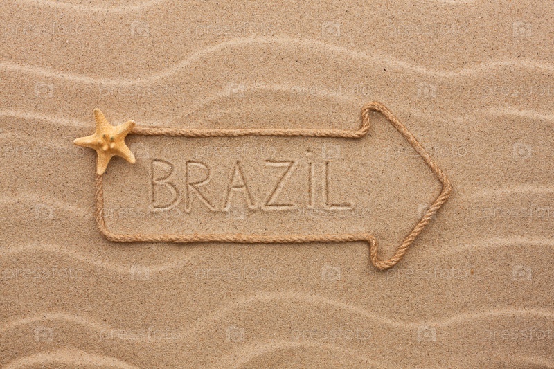 Стрела из веревки и морских ракушек со словом Бразилия на песке