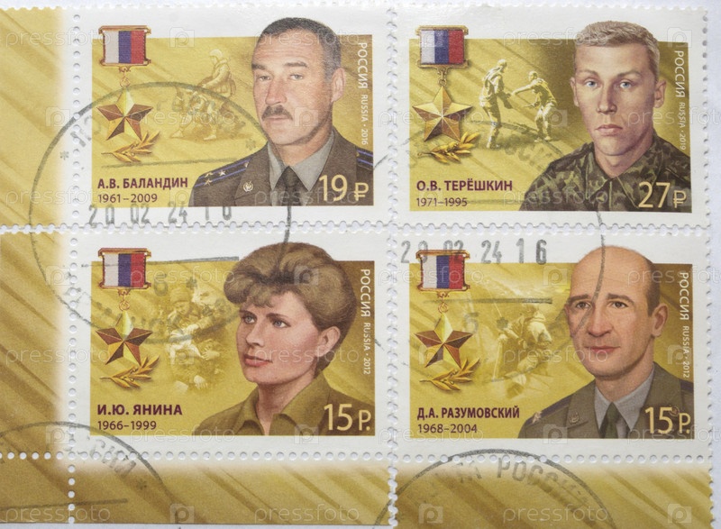 Почтовые марки на конверте из серии Герои России: А.В. Баландин, О.В, Терешкин, И.Ю. Янина, Д.А. Разумовский