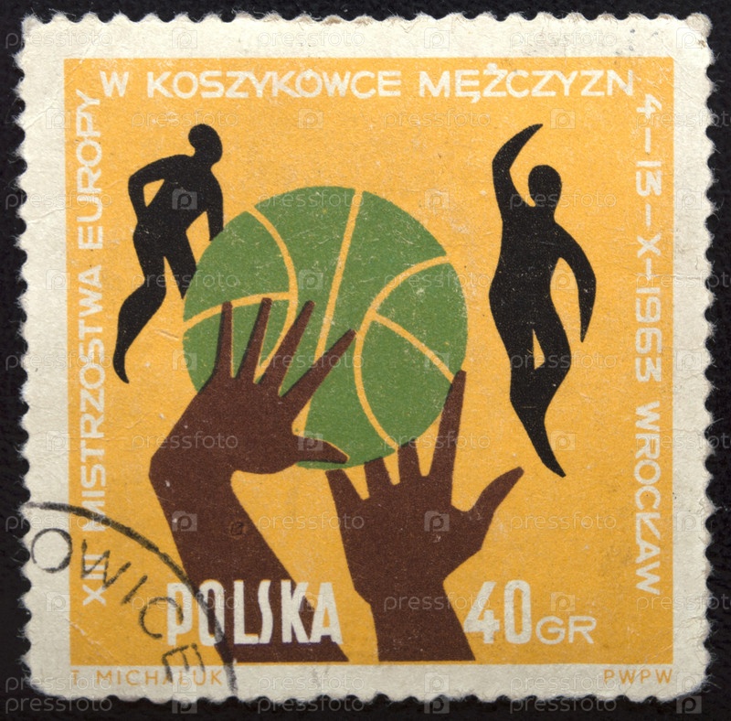 Почтовая марка с гашением Польша 1963 год. Баскетбол, руки и игроки. 13-й чемпионат Европы по баскетболу среди мужчин