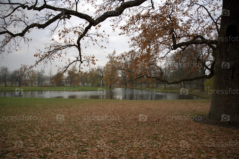 Большая ветка дуба с опавшей листвой, поляна с пожухлой листвой и прудом на заднем плане. Царское село