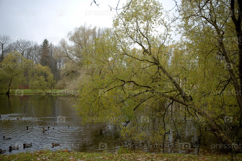 Раскидистая крона ивы над прудом с утками. Осенний пейзаж. Царское село. Александровский парк