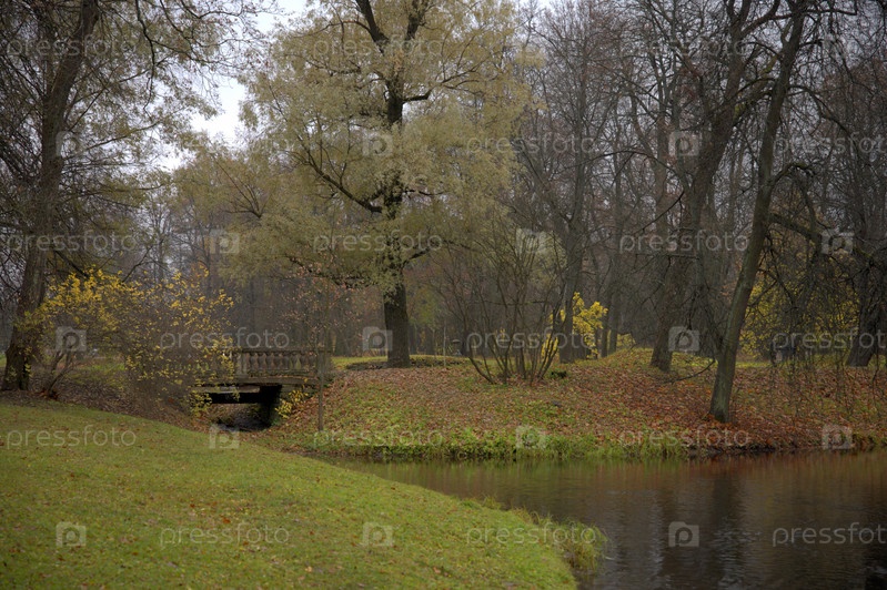 Осень в Царском селе. Александровский парк. Осенний пейзаж с прудом и мостом