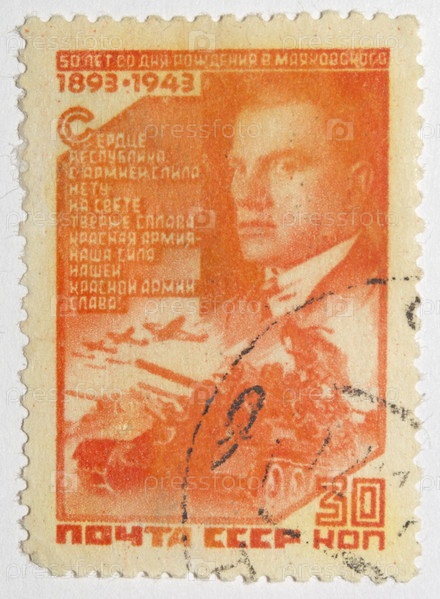 Почтовая марка СССР 1943 года. 50 лет со дня рождения Владимира Маяковского (1893-1943)