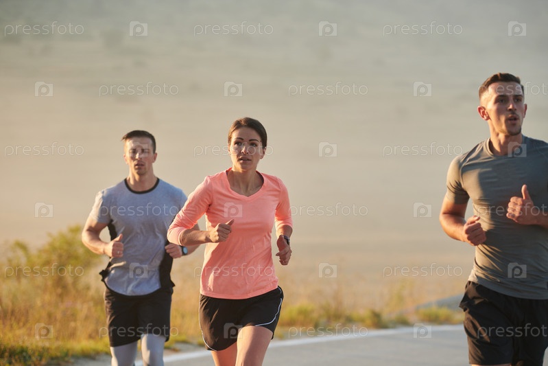 Группа друзей, спортсменов и любителей бега бегом ранним утром пробегает сквозь туманный рассвет, зарядившись энергией восходящего солнца и окруженная спокойной красотой природы