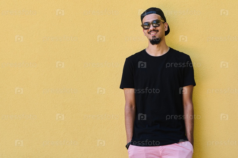 Ближневосточный подросток в повседневной одежде прислонился к желтой стене