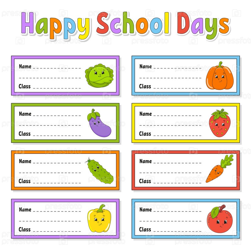 Имя и класс. Обратно в школу этикетки. Установите наклейки для блокнота. Яркие наклейки. Прямоугольная этикетка. Векторная иллюстрация