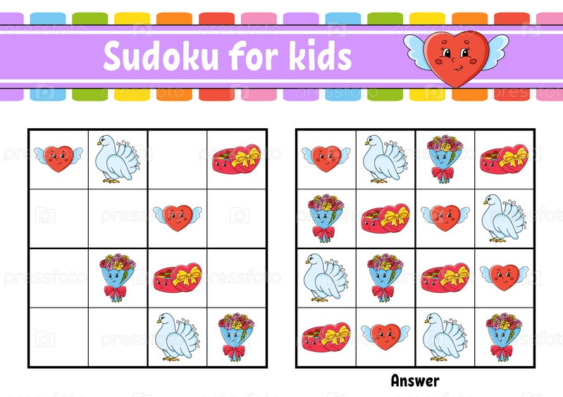 Судоку для детей. Рабочий лист по развитию образования. мультипликационный персонаж. Цветная страница активности. Игра-головоломка для детей. Тренировка логического мышления. Векторная иллюстрация