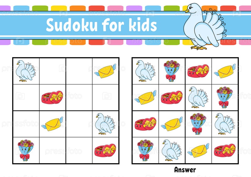 Судоку для детей. Рабочий лист по развитию образования. мультипликационный персонаж. Цветная страница активности. Игра-головоломка для детей. Тренировка логического мышления. Векторная иллюстрация