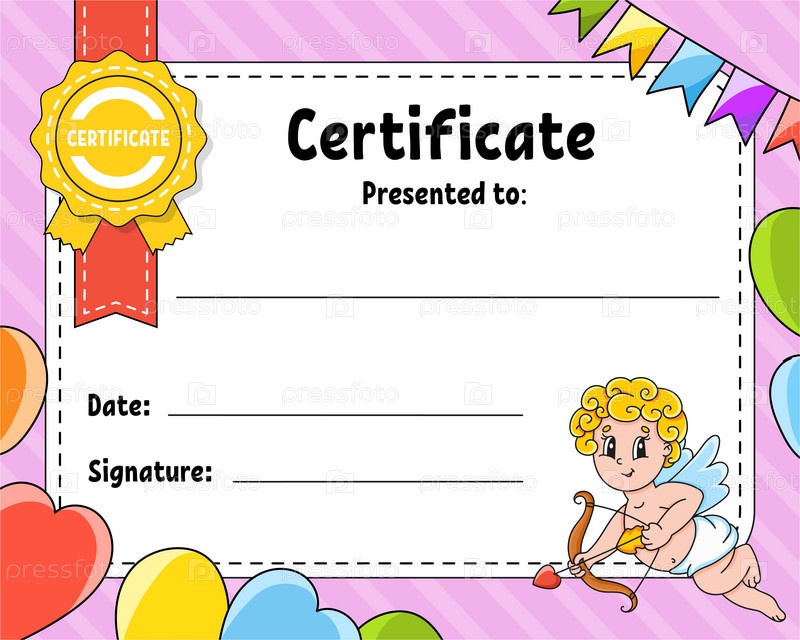Образец сертификата для детей. Красочный диплом школы и дошкольного учреждения. С милым характером. Векторная иллюстрация