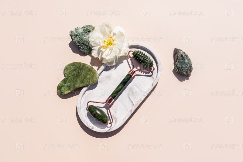 Роликовый массажер из зеленого нефрита и скребок Гуа Ша лежат на овальном мраморном декоративном подносе среди натуральных зеленых камней. Светлый фон