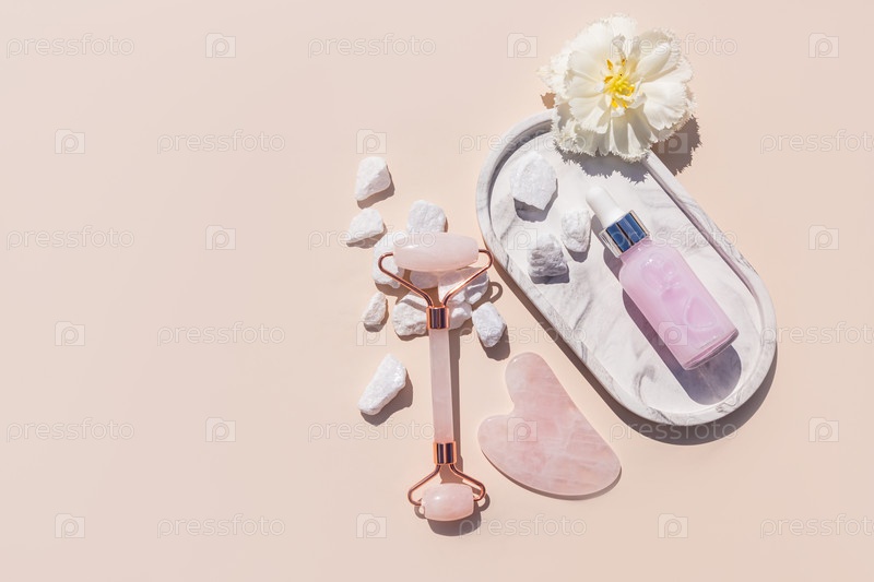 Роликовый массажер из розового кварца и скребок гуаша на белом керамическом подносе с нежным цветком. вид сверху. Концепция массажа и ухода