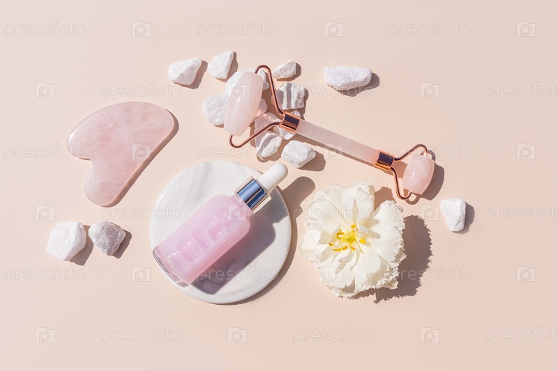 Роликовый массажер, скребок гуаша, натуральное массажное масло в бутылке с капельницей на белом подиуме. Светлый фон. Концепция здоровья и красоты