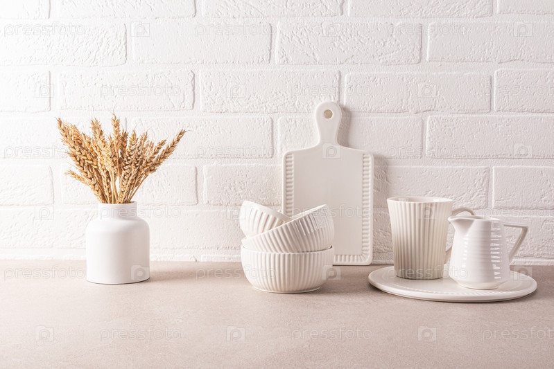 Стильный кухонный фон в минималистском стиле. Белая керамическая кухонная утварь и посуда на каменной столешнице на фоне стены из белого кирпича