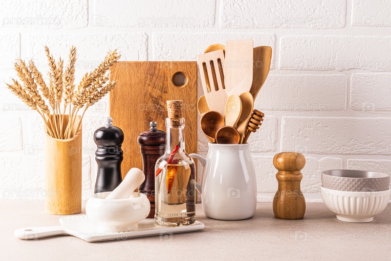 Кухонная утварь для приготовления пищи на каменной столешнице у стены из белого кирпича. Передний план. Экологичная кухня. Стильный кухонный фон
