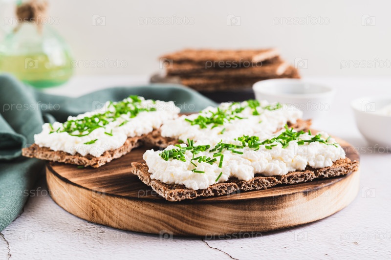Домашние хрустящие ржаные тосты с рикоттой и зеленью на доске