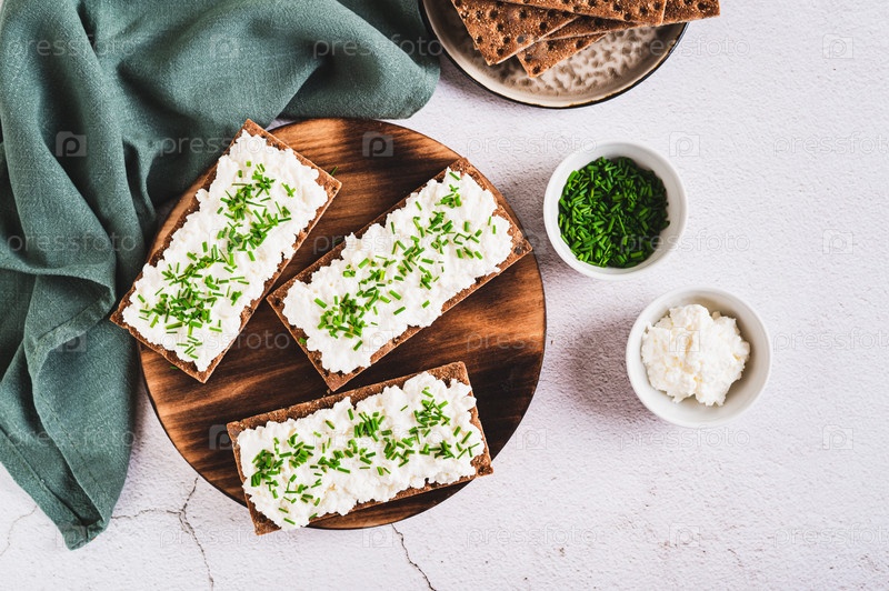 Домашние хрустящие ржаные тосты с рикоттой и зеленью на доске, вид сверху