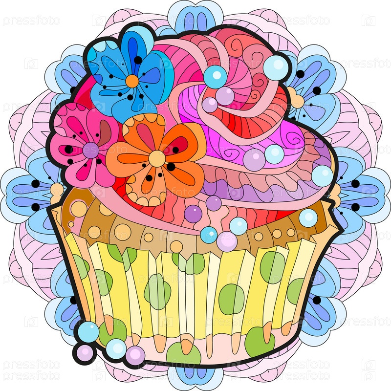 Векторный кусок торта с абстрактными орнаментами мандалы.Ручная иллюстрация к футболке в стиле зентенгл, каракули