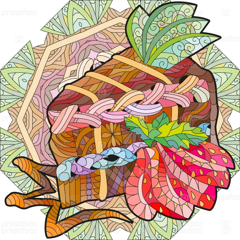 Векторный кусок торта с абстрактными орнаментами на узорчатой круглой подложке. Ручная иллюстрация к футболке в стиле зентангл, каракули