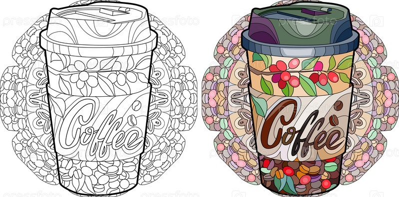 Чашка кофейного напитка с абстрактными орнаментами на мандале для раскраски