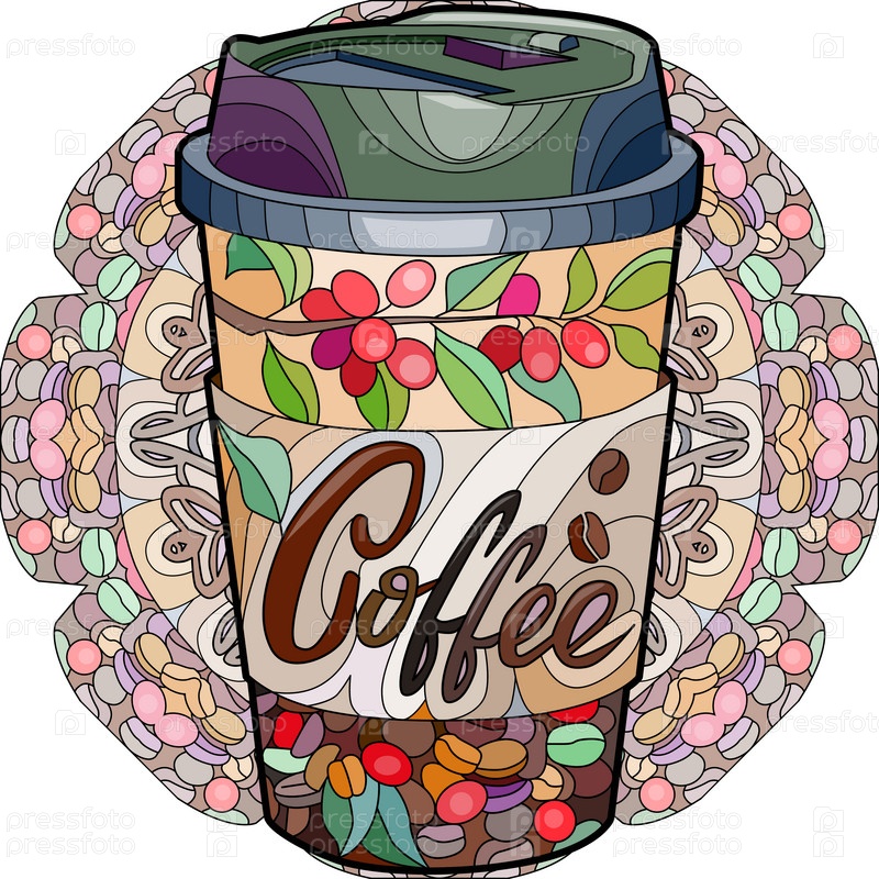 Чашка кофейного напитка с абстрактными орнаментами на мандале