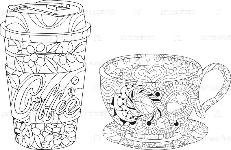 Чашка кофе с абстрактными орнаментами для раскраски. Ручная иллюстрация для украшения футболки