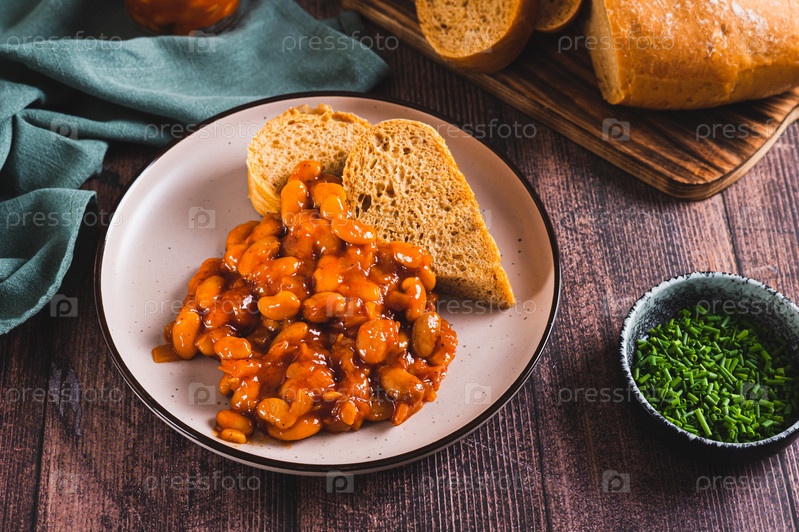 Тарелка с запеченной фасолью в томатном соусе и ржаным хлебом на столе