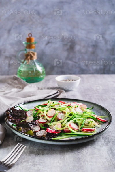 Свежий витаминный салат из огурцов и редиса на тарелке на столе, вертикальный вид
