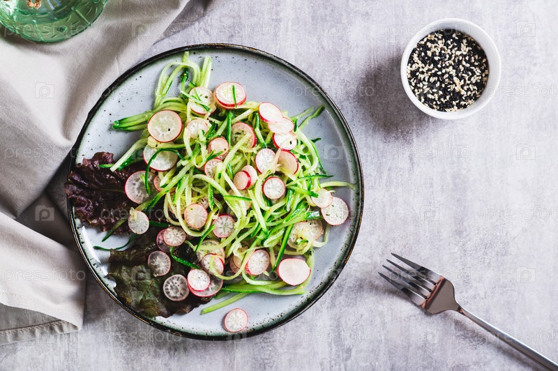 Свежий витаминный салат из огурцов и редиса на тарелке на столе, вид сверху