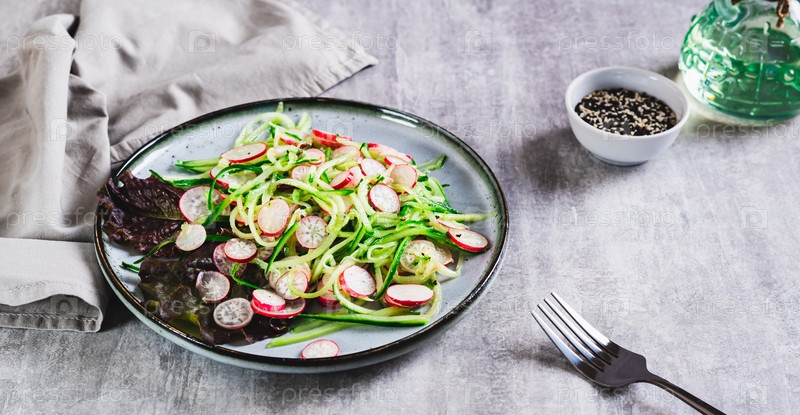 Свежий витаминный салат из огурцов и редиса на тарелке на столе веб-баннер