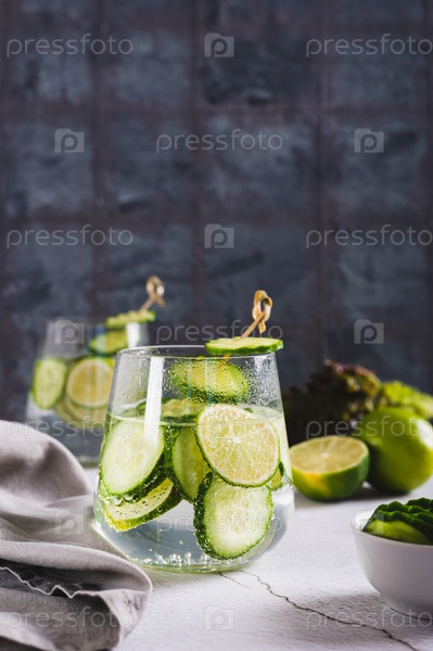 Освежающий газированный лимонад с лаймом и огурцом в стаканах на столе, вертикальный вид