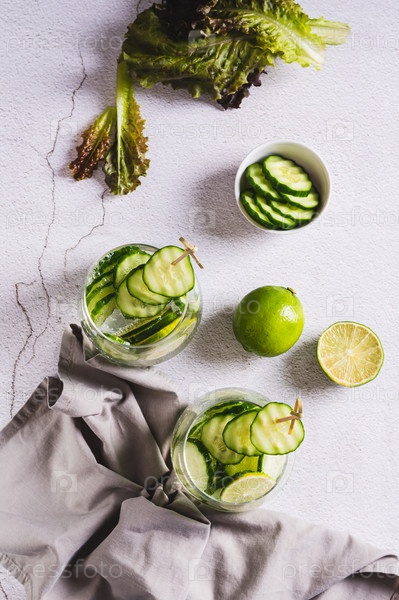 Детокс-коктейль с огурцом и лаймом в стаканах на столе и вертикальном виде