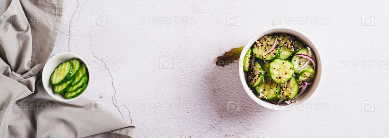 Здоровый органический салат из огурцов, киноа и лука в миске на столе, вид веб-баннера