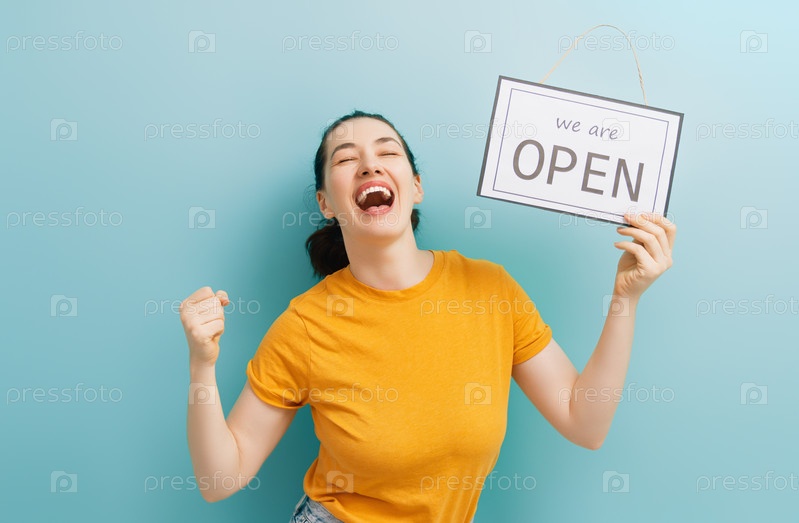 Владелец бизнеса держит табличку о возобновлении работы