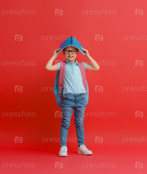 Ребенок с рюкзаком на цветном фоне