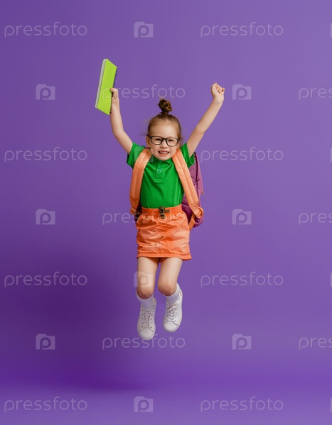 Ребенок с рюкзаком на цветном фоне