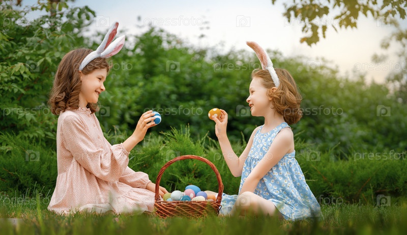 Дети красят яйца на открытом воздухе