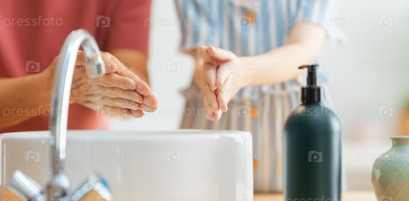 Девочка и ее бабушка моют руки