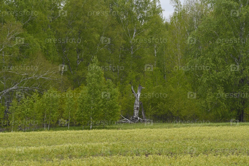 Зеленое поле возле леса. Весенний пейзаж. Сельская местность