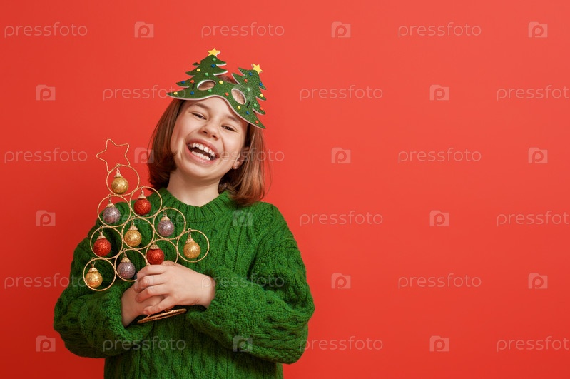 Девушка с елкой на ярком цветном фоне