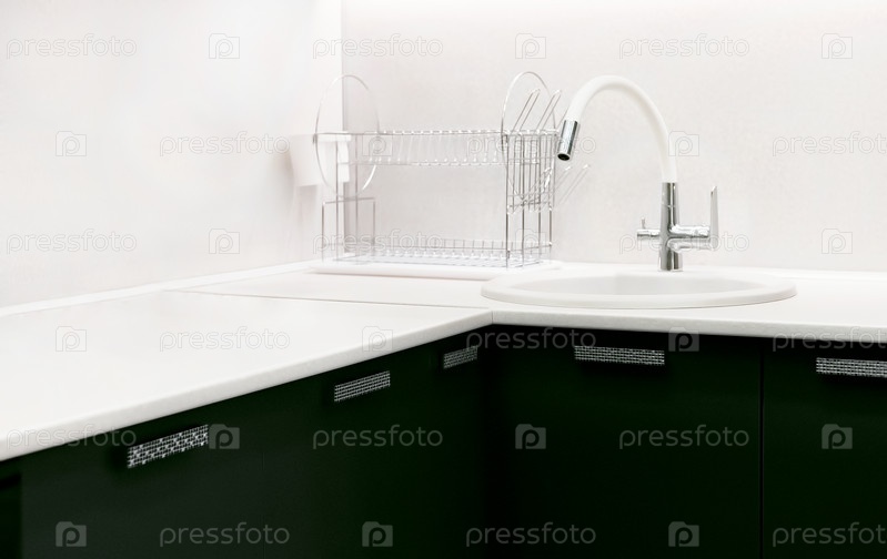 Красивая деталь кухонного смесителя с белыми шкафами, золотым смесителем, столешницами из белого мрамора и фартуком из керамической плитки из коричневого штакетника